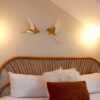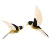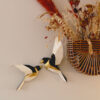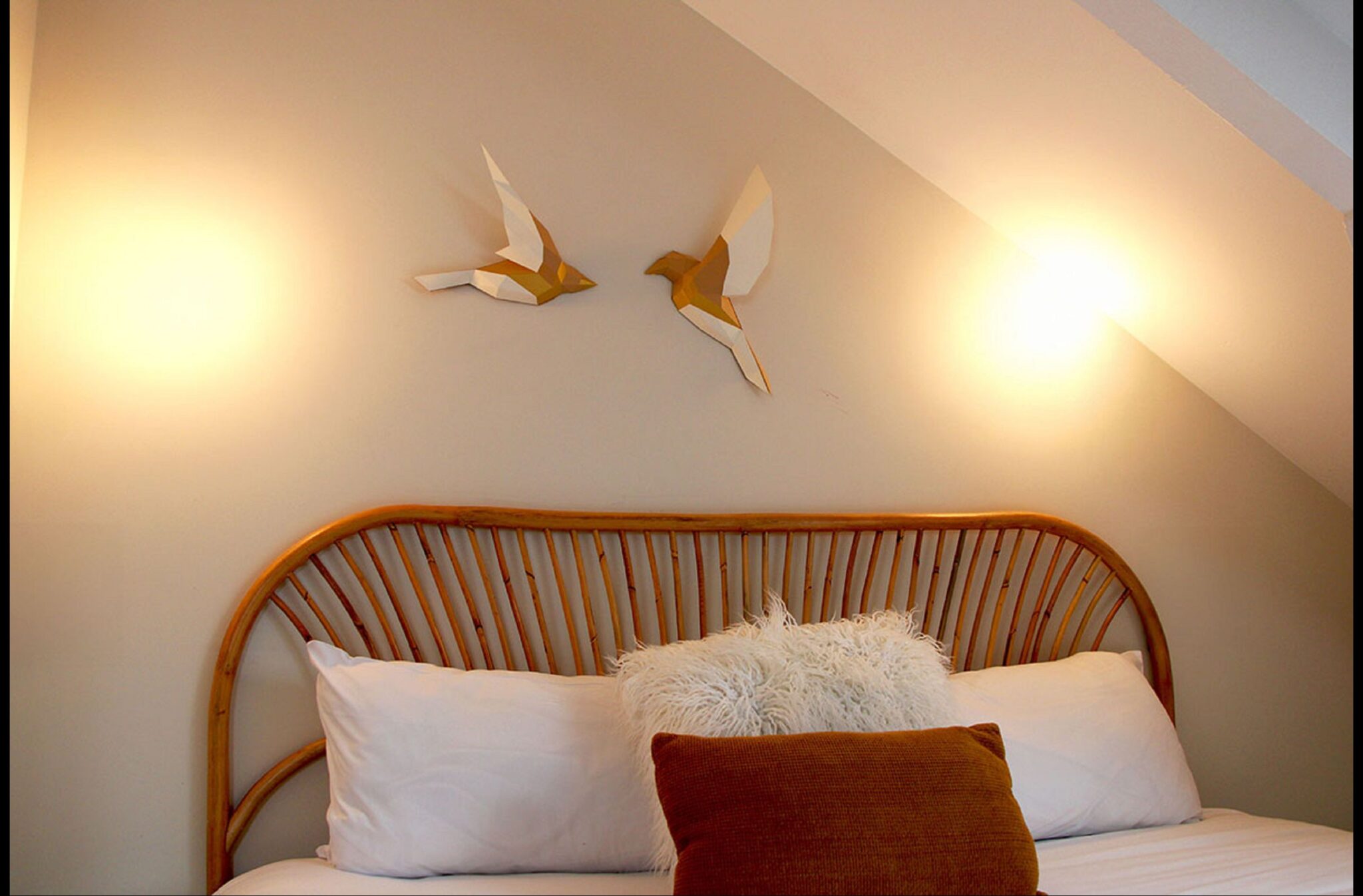 Ce sont deux oiseaux qui ont décidé de se poser sur un mur, mais qui sont restés un peu trop longtemps et qui ont fini à motié fossilisés dedans. Peut-on alors dire que se sont deux oiseaux, ou étant donné que ce sont deux moitiés d’oiseaux, finalement, ça ne fait qu’un oiseau ? Car oui, ces deux oiseaux en papier à monter soi-même sont en fait coupés en profil, afin de les faire tenir plus facilement sur un mur.