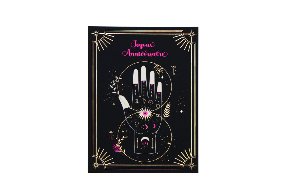 Ces jolies cartes postales d’anniversaire ésotériques ont la particularité esthétique d’intégrer aussi bien des motifs à dorure, que de l’encore rose fluo ! Si si, on vous le confirme il s’agit bien d’une encre fluo, qui est une rareté dans le monde incroyable et magique de l’impression.