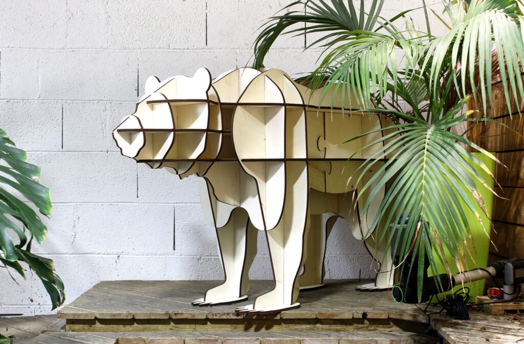 Tu as toujours rêvé d’avoir Baloo ou l’ours Yogi chez toi en guise d’étagère ? C’est chose faite avec notre meuble étagère ours. Ce meuble étagère en bois de bouleau brut n’est pas un gros mangeur, pas besoin de le nourrir en miel ou saumon, de simples livres ou bibelots suivent à lui remplir le ventre.