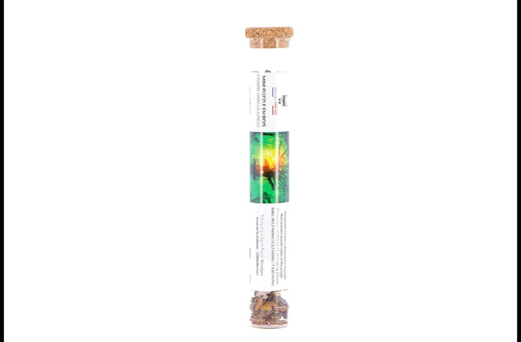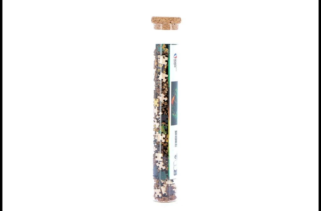 Chacun est présenté dans un tube en verre, parfait pour offrir ou collectionner. Et une fois le dernier morceau posé, on peut décider de le remettre dans son tube ou d’en faire un tableau grâce à l’adhésif fourni avec la notice.