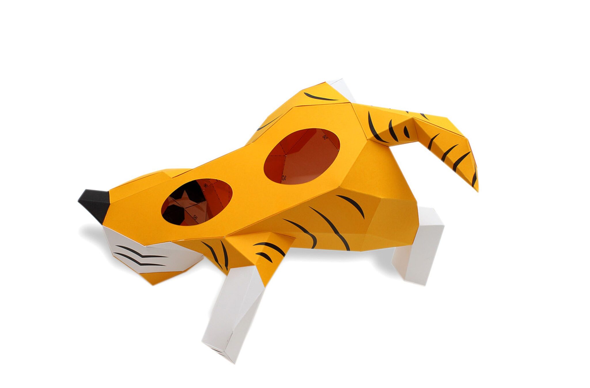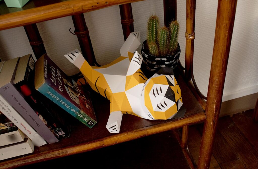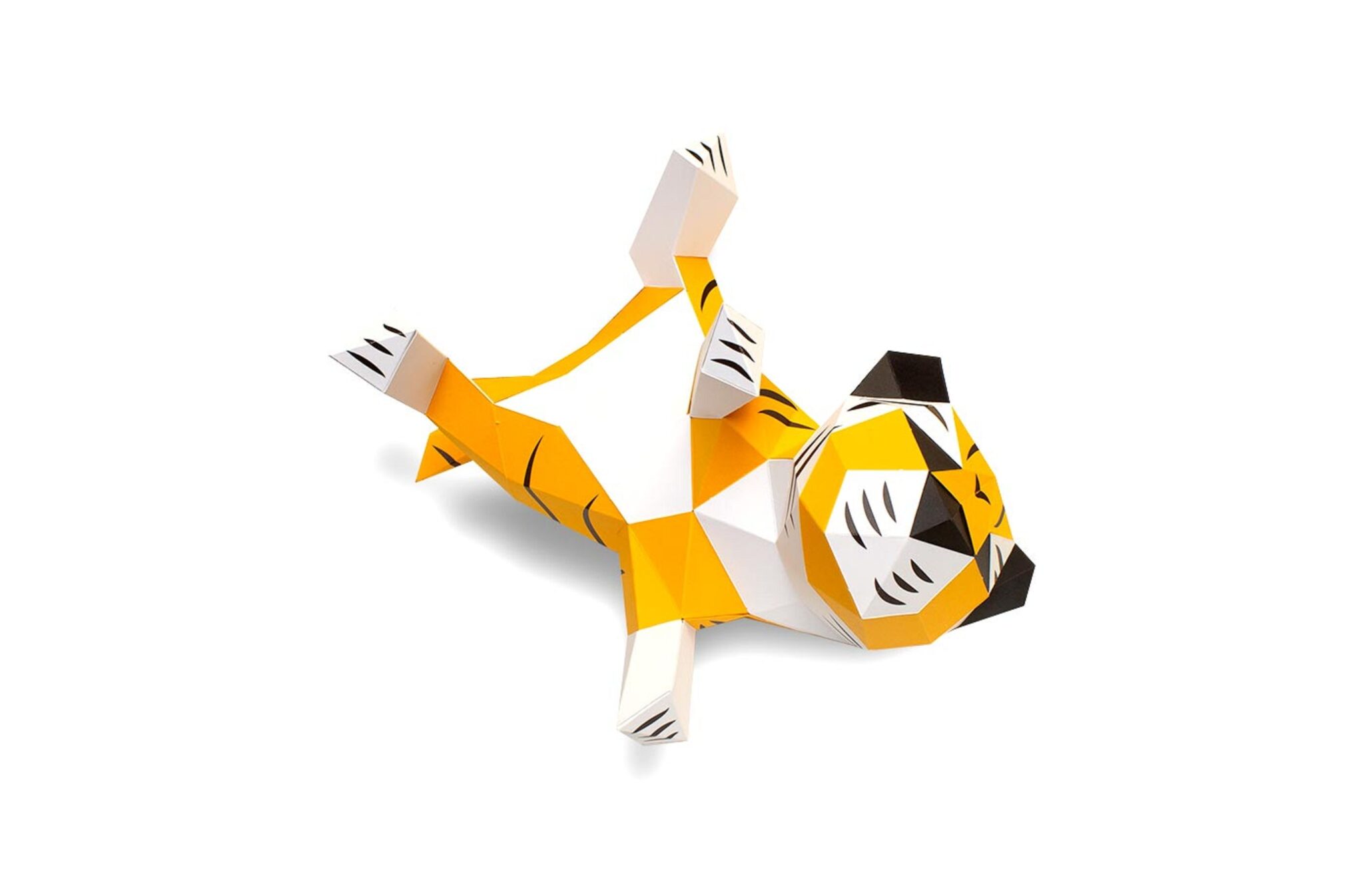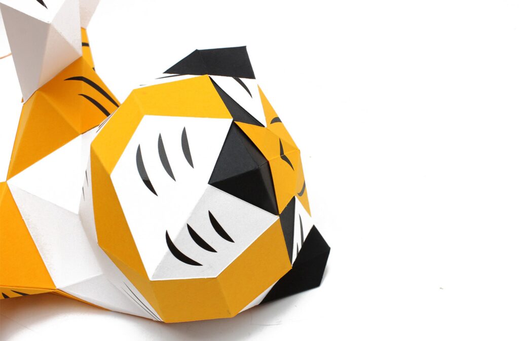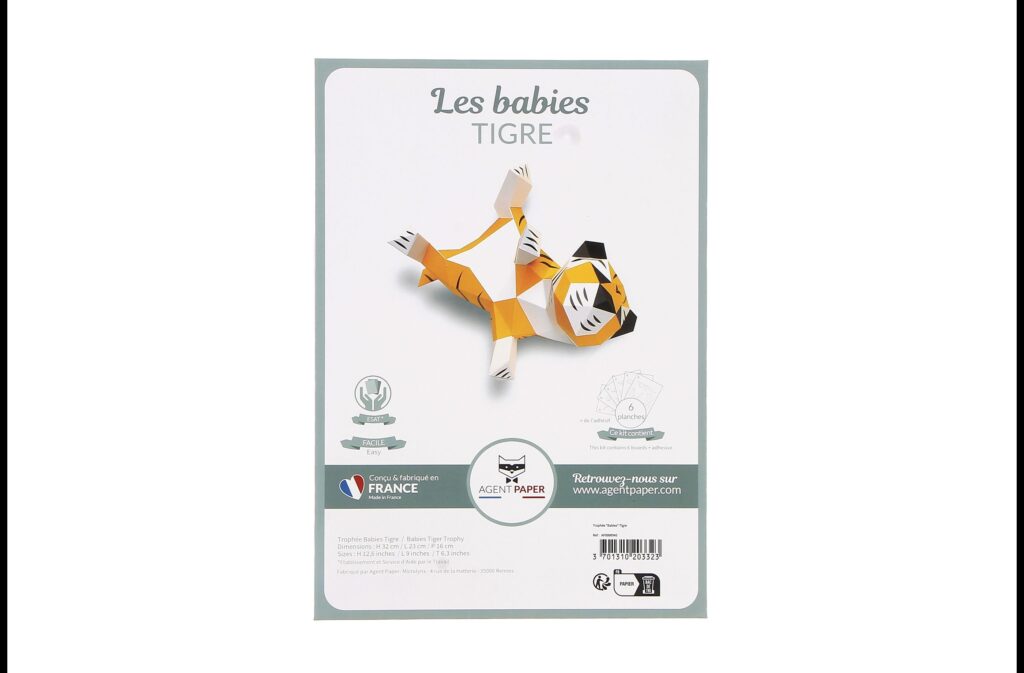 Qu’il est joueur ce petit tigre ! Allongé sur son dos les pattes à l’air, ce bébé tigre en papier est prêt à jouer avec n’importe quelle balle en papier que vous lui lancerez, ou jouer directement avec vos doigts. Pas de craintes de vous faire mordre, ce bébé tigre en papier n’a que des dents en papier et ne peut donc vous faire aucun mal. Ce bébé tigre en papier facile à monter fait partie de la collection les babies, dans laquelle vous retrouverez un tas d’autres animaux tous plus mignons les uns que les autres.